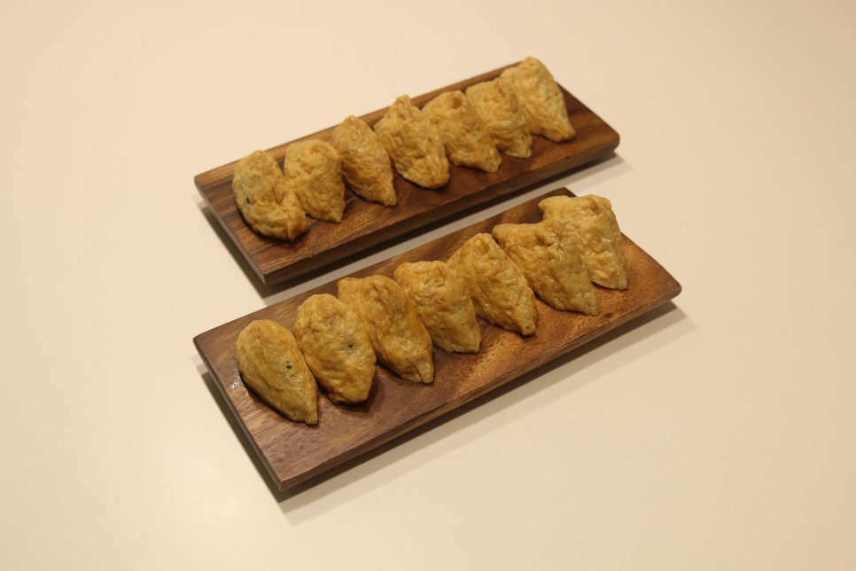 마트에 가면 쉽게 구입할 수 있는 유부초밥. 핑거푸드로 간단한 아침밥으로 활용하는 편입니다. 좀더 특별한 유부초밥으로 하려면 불고기, 크래미 등을 활용하여 속재료를 다양하게 만들면 됩니다.